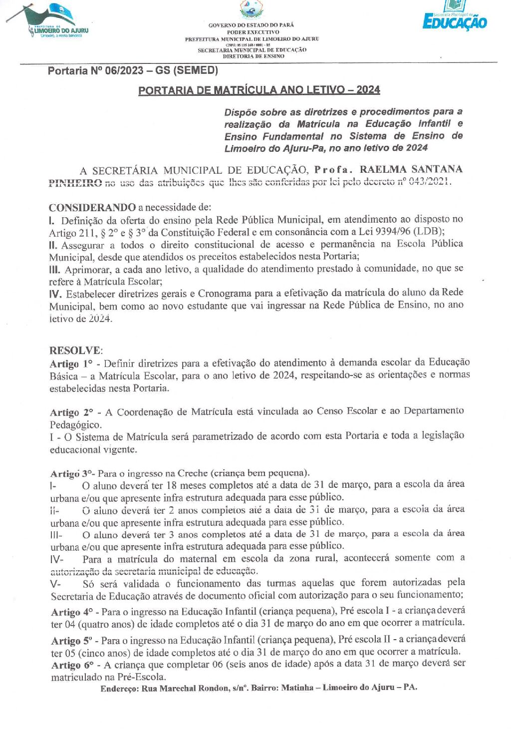 PORTARIA DE MATRICULA DO ANO LETIVO 2024